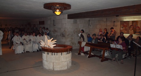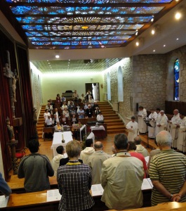 Para finalizar el día los delegados y traductores, reunidos en la capilla coral, entonaban con solemnidad la salve y los españoles después del trabajo de estos años y de un último día de preparación de materiales, organización de habitaciones, recogida de delegados, búsqueda de maletas perdidas y un largo etc. dábamos gracias a Dios porque esta noche por fin, podíamos dormir tranquilos.