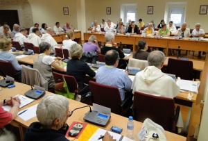 A continuación los delegados han pasado a la sala capitular. Nacho Peiro, encargado de la secretaría, fr. Oscar Jesús, promotor provincial de la provincia de España y Pepe y María José, delegados de Aragón tenían todo dispuesto, por lo que no ha sido difícil encontrar el sitio de cada uno. No tan fácil ha resultado el que los delegados superasen la prueba de hacerse con los equipos de sonido y encontrar el canal en el que debían escuchar a sus traductores.
