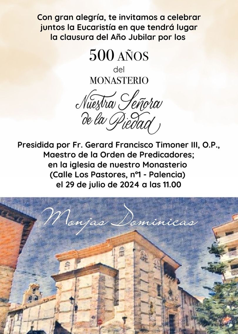 Con motivo de los 500 años de la fundación del Monasterio de Ntra. Sra. de la Piedad de Palencia, las dominicas invitan a la Eucaristía de clausura del Jubileo, presidida por el Maestro de la Orden Fr. Gerard Francisco Timoner II O.P., el 29 de julio a las 11 de la mañana.