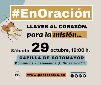 Nuevo ciclo de #EnOración organizado por PastoralSE de los Dominicos de Salamanca, con el título, "Llaves al corazón", la primera "llave" será "para la misión" a cargo de DOMINICOS MISIONEROS - SELVAS AMAZÓNICAS, el sábado 29 de octubre a las 19:00 h., en la Capilla de Sotomayor.