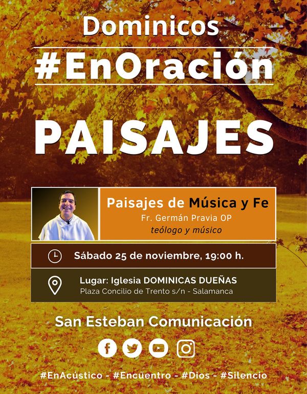 Pastoral Juvenil y Vocacional (San Esteban - Salamanca) continúa con el ciclo de #EnOración, llamado PAISAJES. Durante meses recorrá distintos "paisajes" de nuestra vida personal, social y comunitaria. El segundo paisaje hará referencia a la música y la fe, de la mano de la reflexión de fray Germán Pravia OP.