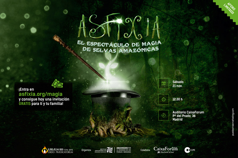 Selvas Amazónicas, institución misionera que lleva más de 100 años defendiendo la dignidad de los pueblos indígenas en la selva amazónica peruana, organiza el espectáculo de magia “Asfixia” que se celebrará el próximo sábado 21 de noviembre en el Auditorio del CaixaForum de Madrid, y que cuenta con la colaboración de COPE, Caixaforum, Escuela de Magia Rafael Píccola y FERE.