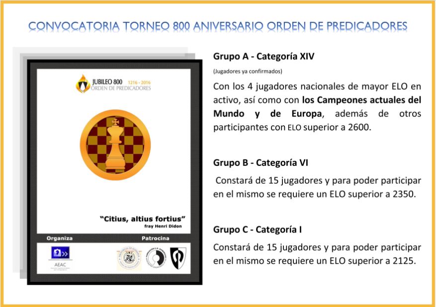 El torneo Jubileo 800 años Orden de Predicadores, durará un tiempo no inferior a 2 años, ya que cada jugador dispone de 50 días para 10 jugadas, de manera que el tiempo se va acumulando. El Grupo A será muy fuerte y jugarán tanto el actual campeón del mundo como el actual campeón de europa, así mismo varios GM (grandes maestros) españoles. Se prevé que será un torneo importante dentro del mundo del ajedrez por correspondencia. El grupo B, sin llegar a la altura del A, será un grupo también fuerte. En este grupo B jugará el dominico fr. Antonio Roy y también participarán dos o tres sacerdotes polacos, buenos jugadores, a los que se ha invitado a participar.