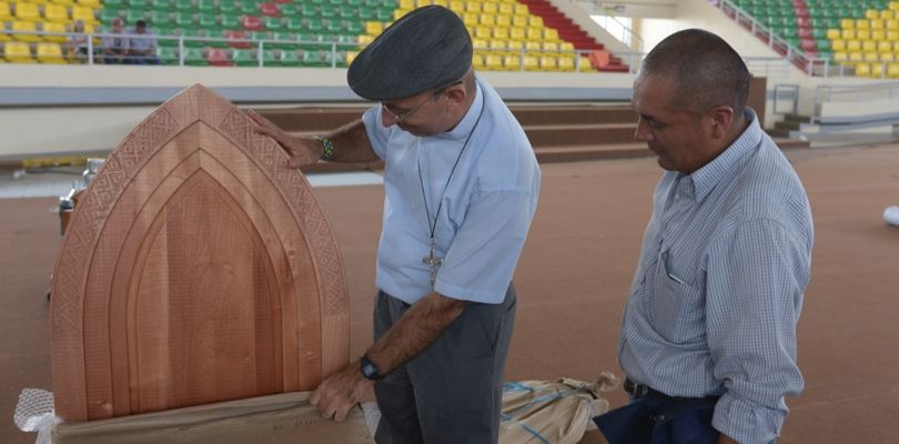 Con el Cristo también llegaron las tres sillas que se ubicarán en el escenario del coliseo, una de ellas, la que estará en el centro, es la que ocupará Jorge Mario Bergoglio.