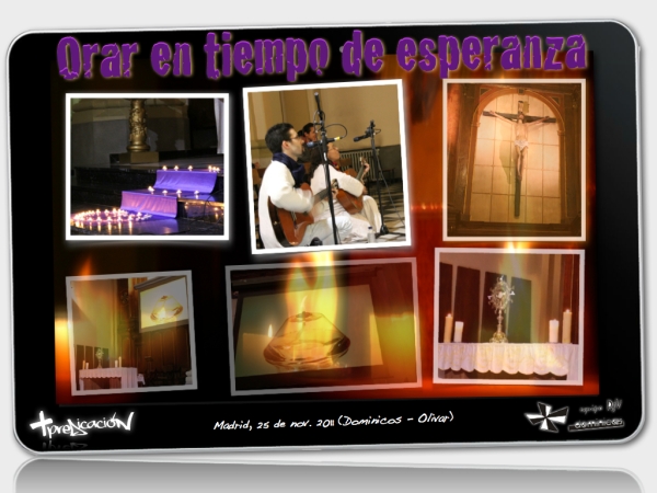 El viernes tuvimos un encuentro de oración. Gente de Familia Dominicana, de parroquias de Madrid, del Cristo del Olivar, y unos cuantos que pasaban por la calle y vieron unos cirios encendimos, nos juntamos, simplemente, a orar, sin otra pretensión que dejar que Dios pudiera hablarnos en en este inicio del Adviento. Lo hicimos desde el silencio meditativo, sin prisas, con los estribillos de canciones que repetíamos una y otra vez - al estilo Taizé-, proclamando la palabra de Dios. La música la llevaron dos cantautores cristianos, Beatriz Elamado (con tres discos en el mercado) y Enrique Mejías, músico profesional, ambos "apostoles de la música y de la evangelización desde el arte". Ellos nos propusieron el formato de la celebración: que el Santísimo presidiera desde el principio toda nuestra oración. La presencia sacramental de Jesús inundó nuestro templo de vida y de confianza en la misión. Nuestra "sed" quedó saciada "bebiendo" de ese manantial inagotable que es Dios.