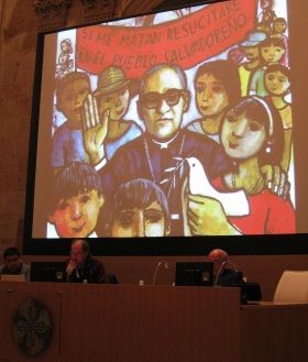 Para ambientar su disertación, comenzó el ponente con un breve reportaje audiovisual sobre el famoso sermón de Antonio Montesinos mostrando las inveteradas raíces de la teología de la liberación, animada desde sus inicios por una recia espiritualidad que se nutre en la defensa innegociable de la vida de los más pobres. Acto seguido fue desentrañando, desde su comprometida experiencia de más de treinta años a lo largo y ancho del continente latinoamericano, los presupuestos, motivaciones, criterios hermenéuticos, contenidos, opciones y compromisos implicados en esta nueva manera de hacer y vivir la teología siguiendo los pasos de Jesús en la memoria martirial de aquellos pueblos. Para finalizar, deleitó a todos los presentes con otro magnífico audiovisual en el que, recurriendo a la iconografía de sus dibujos, murales, mosaicos, vidrieras, carteles, azulejos, etc., plasmaba y sintetizaba de algún modo toda la exposición anterior.