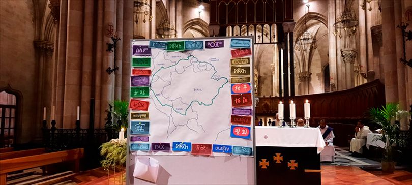 Antes de comenzar el ofertorio, se presentó un mapa que mostraba la zona de la Amazonía y algunos de los presentes a los que se les había repartido unos cartelitos en el que estaba escrita la palabra PAZ en diferentes alfabetos de todo el mundo, y que fueron acercando y colgando alrededor del mapa, simbolizando la universalidad de la paz en el mundo y especialmente en dicha zona.