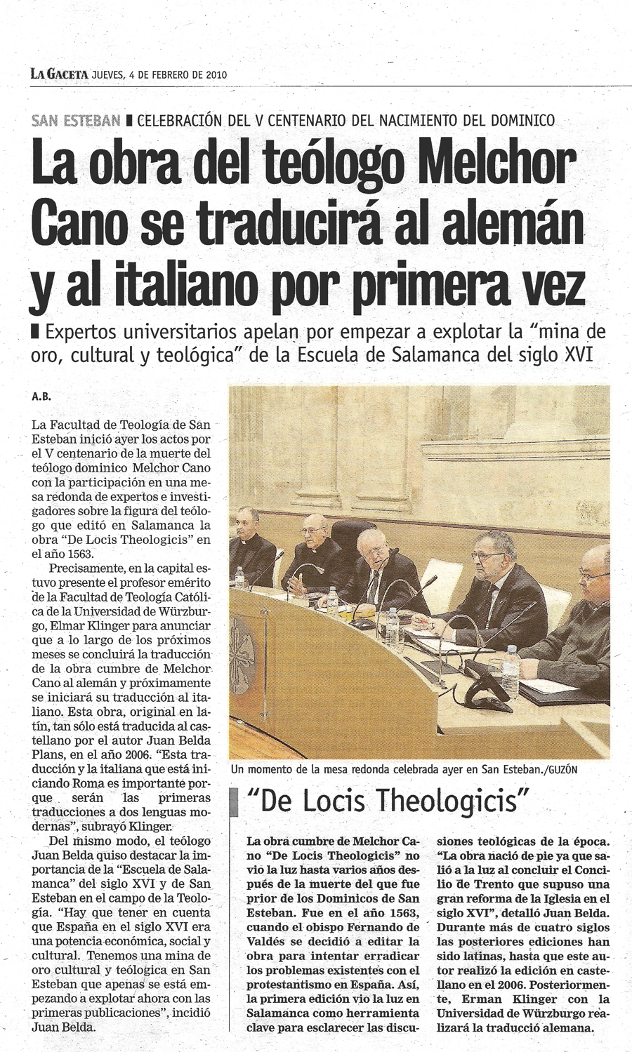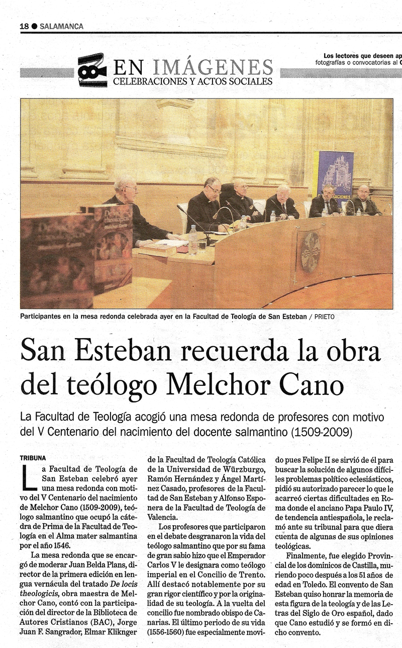 En el acto, organizado por la Facultad de Teología de San Esteban en coordinación con el profesor Juan Belda-Plans, participaron diversos profesores y especialistas en el maestro salmantino y en el Siglo de Oro español: Jorge Juan Fernández Sangrador (director de la Biblioteca de Autores Cristianos, B.A.C.); ElmarKlinger (prof. ordinario emérito de Teología Fundamental de la Facultad de Teología de la Universidad de Würzburgo,que prepara la edición alemana del De locis theologicis); Juan Belda-Plans (director de la primera edición en lengua vernácula del tratado De locis theologicis);Ramón Hernández, O.P. (profesor de San Esteban y gran especialista en la Escuela de Salamanca, de la que Cano fue un representante cualificado); Alfonso Esponera,O.P. (historiador de la Teología en la Facultad de Teología San Vicente Ferrer de Valencia); y el profesor Ángel Martínez Casado O.P. (profesor de Historia Eclesiástica en la Universidad Pontificia y en la Pontificia Facultad de teología San Esteban de Salamanca).