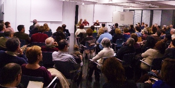 Durante más de una hora dialogaron Jesús Conill, filósofo, y Vicente Gallego, poeta: perspectivas distintas, puntos comunes, experiencias vivas, se enlazaban con gran viveza a lo largo de este tiempo que nos pareció escaso. Después, algunos asistentes entraron en ´la conversación, centrando cuestiones, aportando experiencia o sugiriendo nuevas vetas que explorar.