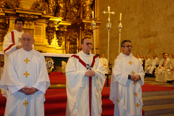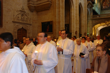 El acto venía precedido por una Eucaristía solemne celebrada en la misma Iglesia con motivo de la Jornada de la Vida Consagrada. Este año la eucaristía, presidida por el Sr. obispo de la diócesis, se celebró en la iglesia de San Esteban de los dominicos. La razón también fue que se celebra el IV centenario de la finalización de las obras de la iglesia. La iglesia es una de las más bellas de la Orden y podemos también de afirmar que de las majestuosas de la iglesias que no son catedrales. La CONFER diocesana, que es quien convoca todos los años el dos de febrero a la celebración eucarística y renovación de la consagración religiosa, aceptó con agrado que dicha iglesia, en vez de la catedral, acogiera la celebración. Fueron muchos los religiosos y religiosas y miembros de la vida consagrada secular los que se hicieron presentes. Luego hubo un momento de convivencia en el sorprendente claustro de De Profundis del convento. D. Carlos fue saludando a los religiosos y religiosas,y departió más ampliamente con los jóvenes. Fue un día importante para la comunidad de dominicos de San Esteban en el año que celebran el IV centenario de su iglesia.