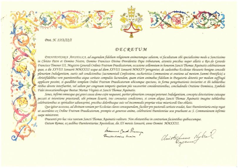 Con el fin de encender aún más nuestro espíritu de gratitud al Señor, Dador de todas las gracias, solicitamos a la Santa Sede la concesión de la indulgencia plenaria (ver rescripto adjunto) para los fieles debidamente dispuestos que participarán en las celebraciones eucarísticas organizadas por la Familia Dominicana en nuestras iglesias y escuelas en las ocasiones importantes del jubileo de la canonización y muerte de Santo Tomás de Aquino, y para los fieles que peregrinarán a iglesias, santuarios y oratorios bajo su patrocinio. Las celebraciones del doble jubileo serán del 28 de enero de 2023 al 28 de enero de 2025. Por favor, proporcionen la catequesis necesaria sobre el significado de la indulgencia, así como las condiciones prescritas por la Santa Madre Iglesia para su digna recepción.
