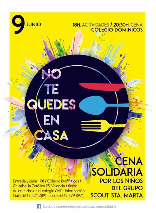 El próximo viernes 9 de junio tendrá lugar en el Colegio Dominicos San Vicente Ferrer de Valencia la cena solidaria No te quedes en casa, organizada por un grupo numeroso de jóvenes del grupo Endavant, perteneciente al Movimiento Juvenil Dominicano, con la colaboración de otros grupos de dominicos. El dinero recaudado irá destinado al Grupo Scout Santa Marta, ubicado en el barrio de la Fuente de San Luis.