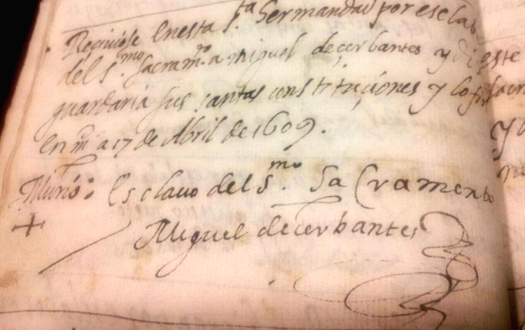 Cervantes es de los primeros inscritos en la cofradía, dejando constancia con su firma autógrafa de su ingreso. El texto dice así: “Recibióse en esta santa hermandad por esclabo del Santísimo Sacramento a Miguel de Cerbantes y dixo que guardaría sus santas constituciones, y la firmó en Madrid a 17 de Abril de 1609. Esclavo del Santísimo Sacramento Miguel de Cerbantes”. Alguien añadió con tinta roja en el margen izquierdo una cruz y la palabra “murió”. Probablemente un día de finales de abril de hace 400 años.
