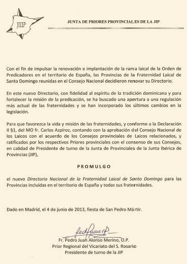 Hoy 4 de Junio, Fiesta de San Pedro Mártir, Fray Pedro Juan Alonso Merino OP, Prior Regional del Vicariato del Santo Rosario y Presidente de Turno de la Junta Ibérica de Provinciales, ha promulgado el nuevo Directorio Nacional de la Fraternidad Laical de Santo Domingo para las provincias incluidas en el territorio de España y todas sus fraternidades.