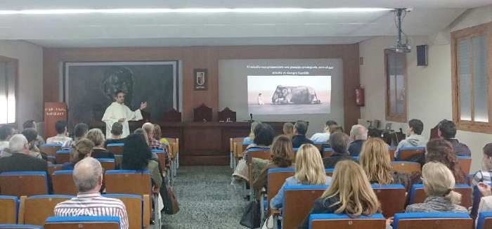 De una forma amena, que cautivó al profesorado del colegio, Fr. Moisés expuso cómo el estudio en la Orden de Predicadores es búsqueda compartida de la Verdad. Que el estudio es una manera de ser y también una praxis, es decir, consiste en un mirar y un obrar nuevos. Es tener ojos para lo que otros no los tienen, leer entre líneas la realidad. Es obrar según un mundo rico y lleno de matices, un mundo cuyo cimiento es el amor.