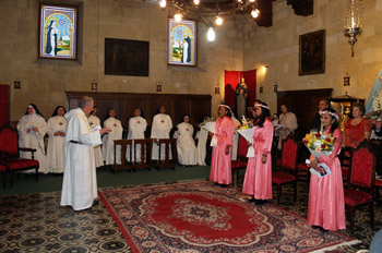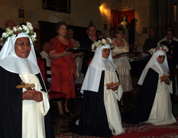 Mientras son vestidas con el hábito se canta el VENIT CREATOR. Una vez finalizada la vestición se postraron de nuevo en tierra, y mientras todos, unidos, oramos por ellas. Siguió la bendición de crucifijos que les fueron entregados a las novicias.