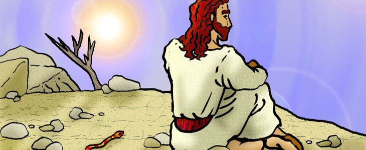 Después de su bautismo el Espíritu llevó a Jesús al desierto y allí ayunó durante cuarenta días y cuarenta noches. Jesús, con tan largo ayuno, sintió hambre y se le acercó Satánas y le dijo que convirtiese las piedras en pan. Pero Jesús le dijo: -No sólo se necesita el pan para vivir, también la Palabra de Dios. En otra ocasión el demonio puso a Jesús sobre las almenas del templo y le dijo: -Si eres el Hijo de Dios, tírate abajo, que no te pasara nada pues los ángeles cuidarán de ti. Pero Jesús respondió: -Está escrito No tentarás al Señor tu Dios. Por último el diablo mostró a Jesús todos los reinos de la Tierra y le dijo: -Póstrate ante mi y todo será tuyo Pero Jesús le dijo: -Vete Satanás, porque está escrito: Al Señor tu Dios sólo adorarás. El demonio lo dejó y los ángeles le sirvieron con amor.