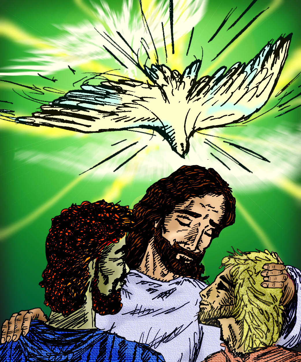 Al despedirse Jesús de los apóstoles, estos se quedaron muy tristes. Jesús al verlo les animaba diciéndoles: -Si me amáis cumpliréis mis mandamientos. Y si os he dicho que estaré con vosotros y vosotros conmigo, ¿cuál es el motivo de vuestra tristeza? No os preocupéis ni acobardéis pues yo le pediré a mi Padre que os de otro defensor: el Espíritu que os dará la paz si seguís mi voluntad.
