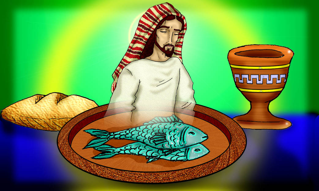 De nuevo se apareció Jesús a sus amigos, después de resucitar y les saludo con las mismas palabras: ¡La paz sea con vosotros! Ellos seguían medio desconcertados. Jesús continuó diciendo: ¡No tengáis miedo. Soy yo. Si tenéis algo para comer vamos a compartirlo! Y comió con ellos un trozo de pescado a la brasa. Poco a poco iban aceptando que Jesús había resucitado y empezaban a quitarse miedos y tristezas.