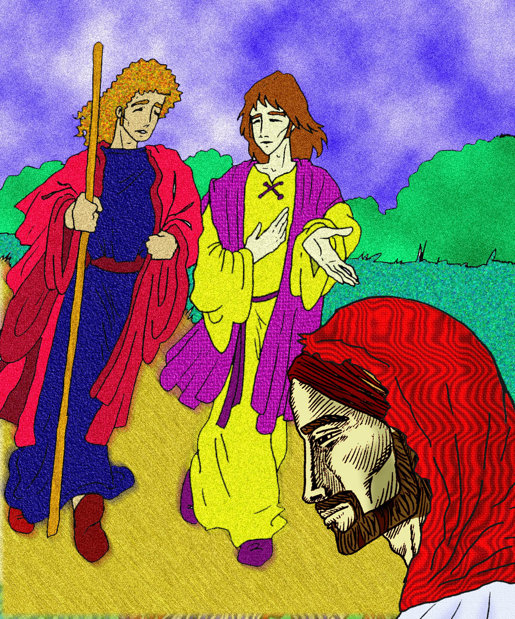 NARRADOR: Os iba diciendo que por aquellos días, dos amigos de Jesús caminaban hacia Emaús. Era éste un pueblecito que está a unos kilómetros de Jerusalén. Iban hablando de las mismas cosas que habéis hablado vosostros. Entonces vieron a un hombre que se puso a caminar a su lado.