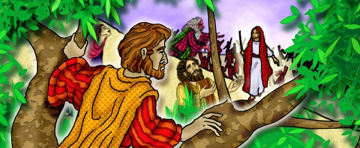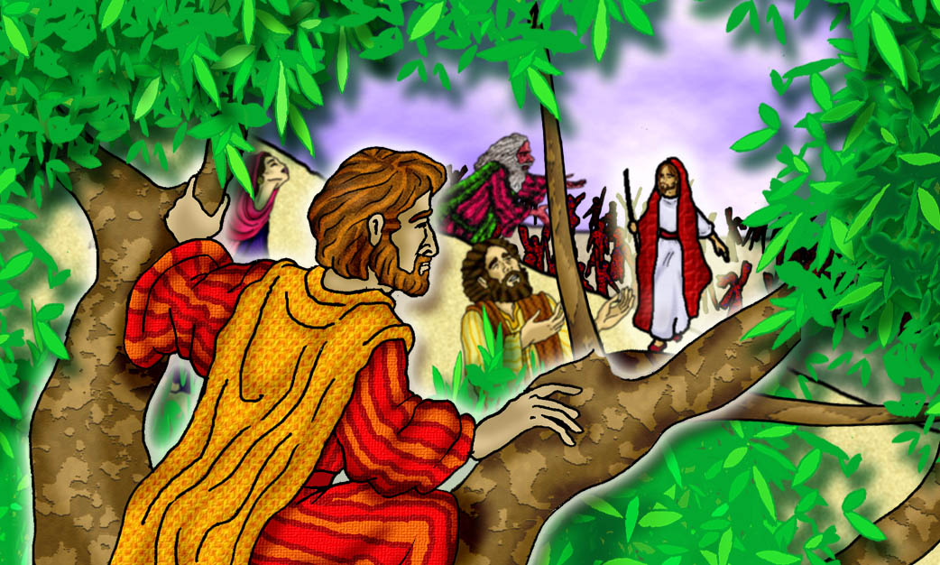 NARRADOR: Jesús fue a visitar la ciudad de Jericó. Las personas se ponían a los lados de las calles esperando verle. Una de las personas entre la multitud era un hombre muy bajito. Era tan bajito que no alcanzaba a ver por encima de la muchedumbre. Este hombre se llamaba Zaqueo, era jefe de publicanos y rico. Él quería ver a Jesús, así que trepó a un árbol y esperó a que Jesús pasara por allí. Jesús al llegar a aquel sitio miró hacia arriba y le dijo: