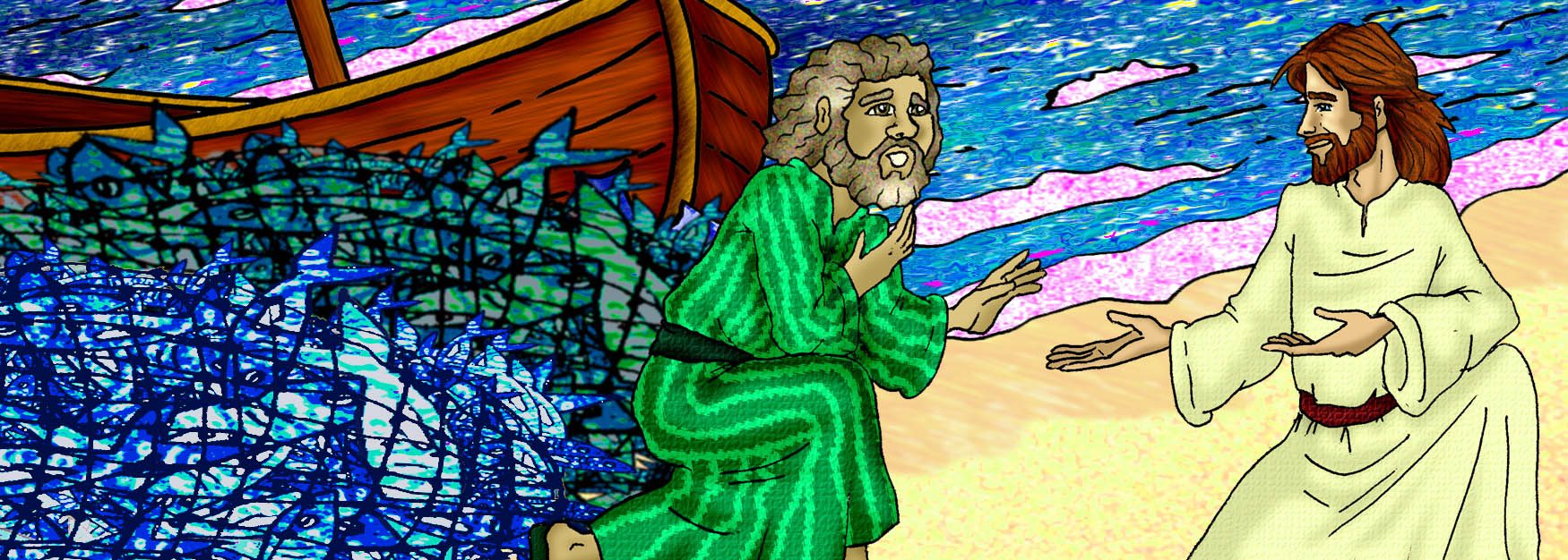 Lucas: Se acercaron y llenaron las dos barcas. Tantos peces había, que las dos barcas casi se hundían por el peso. Al ver esto, Simón se arrodilló delante de Jesús, diciendo: