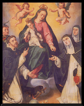 - La Virgen entrega el Rosario a Santo Domingo y a Santa Catalina de Siena y otros dos santos dominicos