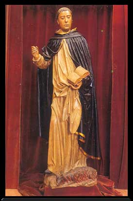 Su gesto viril queda suavizado al contacto con el tratamiento suave de las telas. Las líneas horizontales de la capucha negra sobre el pecho rompen con la severidad de su fisonomía. Los pliegues de la capa negra cuelgan a ambos lados de los brazos, con plisados modelados y pinzas entrecruzadas con gran realismo, interrumpidos por otros pliegues ahuecados y quebrados en diagonal, que quiebran la caída natural de la tela. El escapulario blanco desciende en formas entubadas y pinzamientos, que recoge la mano izquierda, juntamente con el libro. Por debajo de éste, asoma una daga colgada de la cintura, para guardar el cuchillo. La túnica blanca lleva idéntico modelado. A sus pies, se acurruca la loba entre llamas, sometida y humillada. La restauración le ha devuelto a la escultura su primitiva frescura.