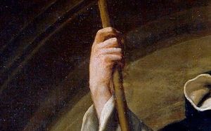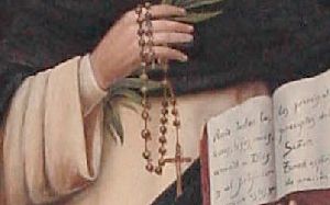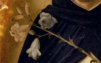 Frecuentemente se añaden una lila blanca en su mano izquierda y una estrella en su frente. Todo ello se refiere a aspectos o sucesos de la vida de Santo Domingo. Veamos su significado.